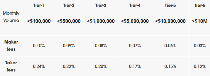 A bolsa usa uma abordagem em camadas com relação às taxas de negociação e as taxas para todas as transações (em um volume mensal de $ 100.000) são calculadas de acordo com a Camada 1.